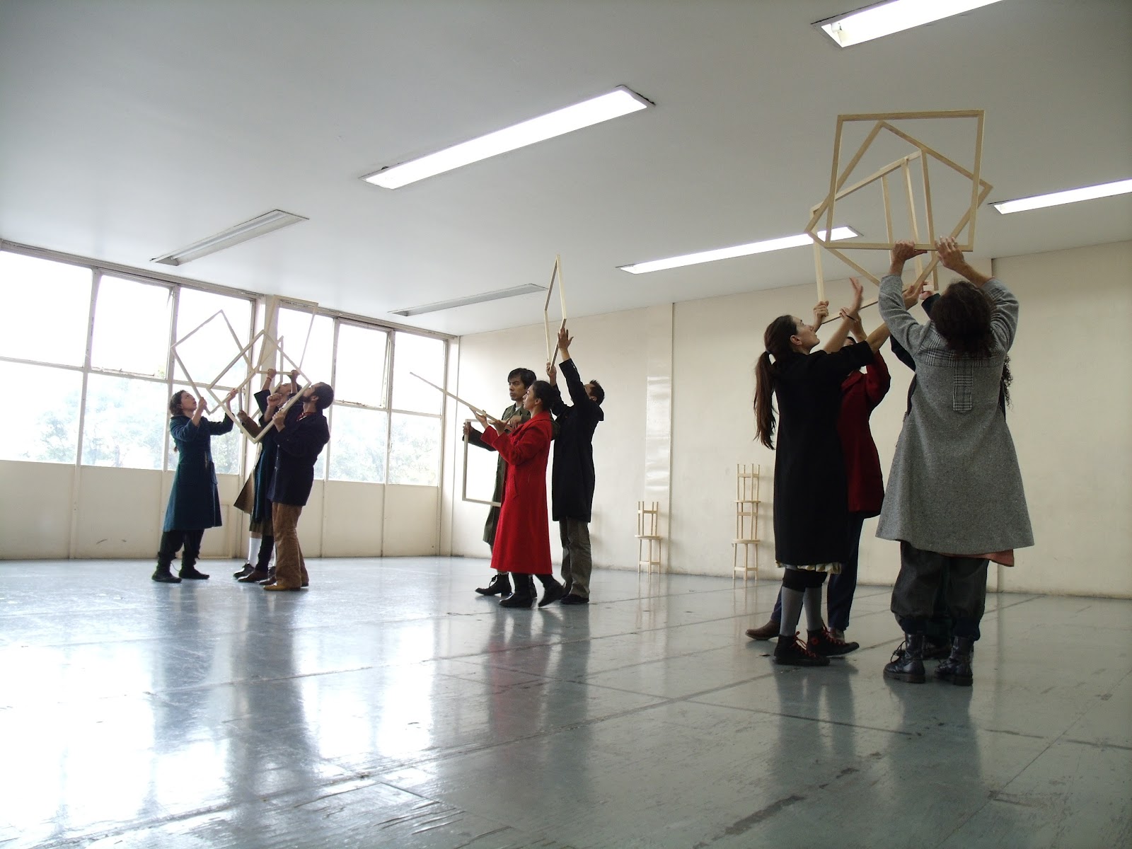 SH: Pues es algo muy curioso porque yo empecé con mi taller en invierno y entonces hacía mucho frio en Berlín y empiezo a observar cómo mis alumnos se quitaban y se ponían los abrigos para después volvérselos a poner en los ensayos, haciendo todo un circo, puesto que la mayoría de sus abrigos eran pesados y grandes, fue así que surge este acto de los abrigos, que ahora ya son parte fundamental en la obra.