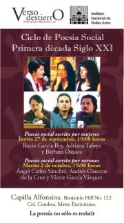 El Instituto Nacional de Bellas Artes (INBA) invita a la actividad denominada Poesía social escrita por mujeres: primera década del siglo XXI con la participación de Rocío García Rey, Bárbara Oaxaca y Adriana Tafoya; modera Andrés Cardo. La cita es en la Capilla Alfonsina; jueves 27 de septiembre, 19:00 horas, en Benjamín Hill 122, colonia Condesa (Ciudad de México).