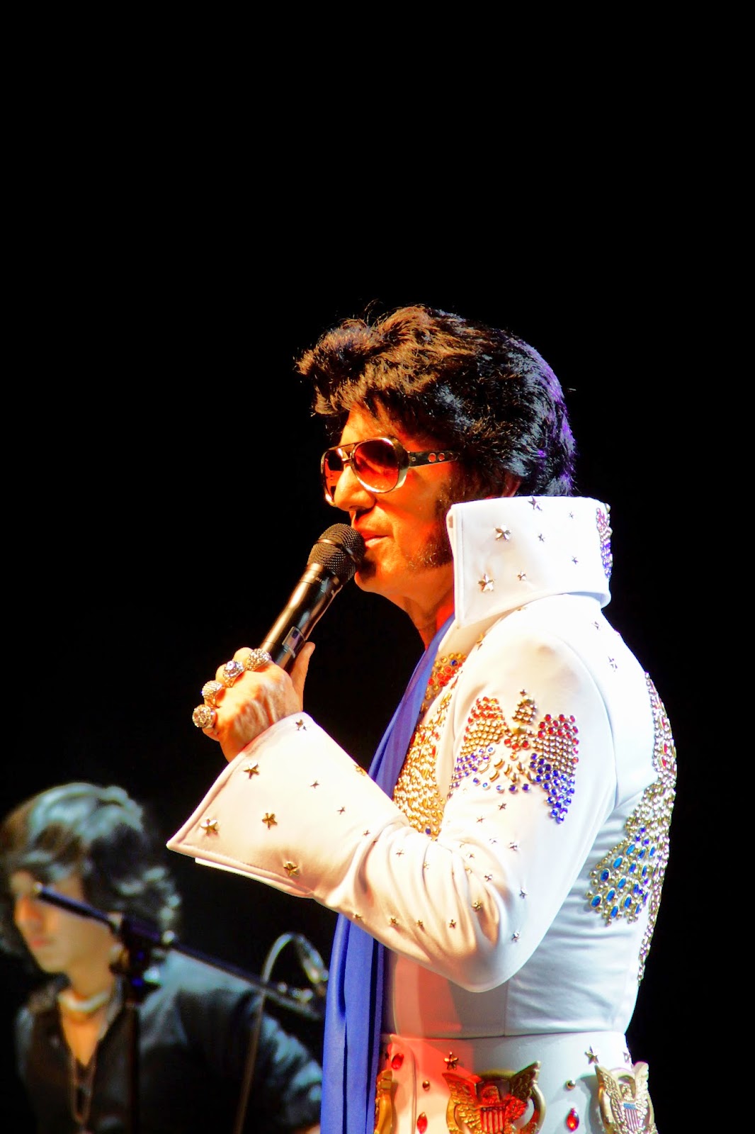 quien ataviado con los vestuarios con los que recordamos a Elvis, como trajes llenos