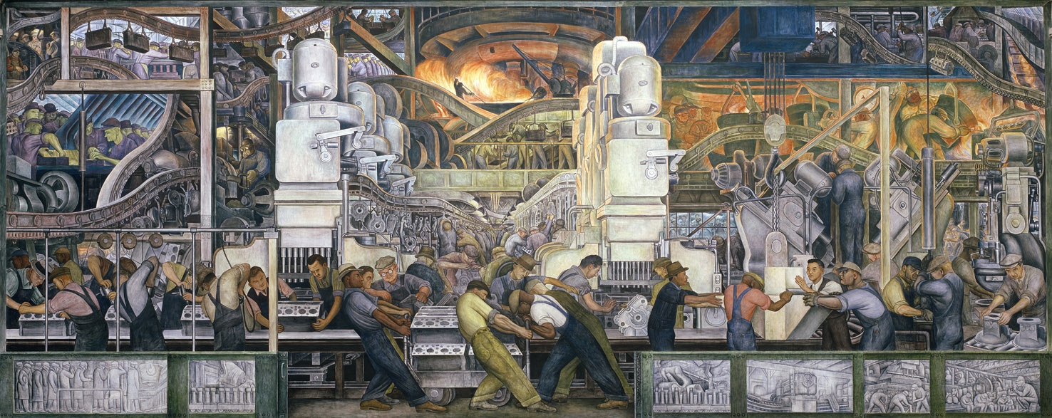 Destacan 9 piezas procedentes del San Francisco Museum of Modern Art, así como bocetos, dibujos, apuntes y fotografías que sirvieron a Rivera para pintar los murales de Detroit y Nueva York. Estos dibujos no habían salido antes de Estados Unidos, por la delicadeza del material.