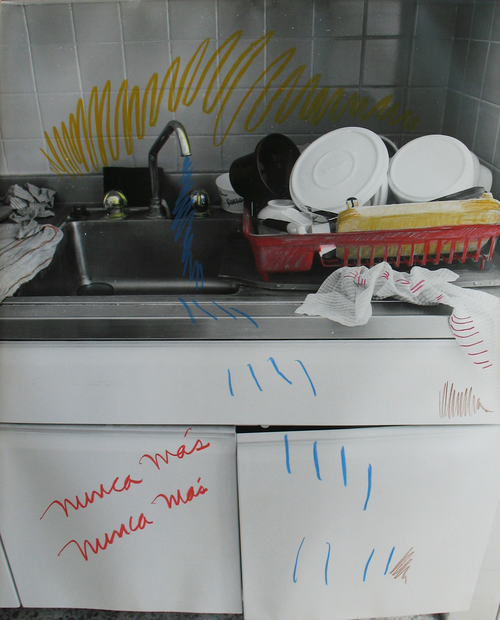 combina collages, dibujos, cerámica, fotografías y libros que abren una ventana