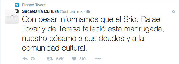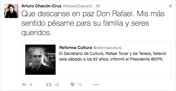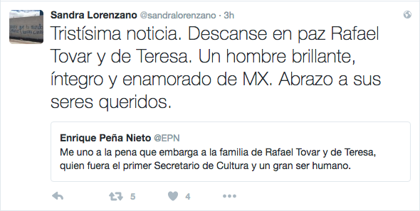 Ciudad de México, 10/12/2016, (N22).- Minutos antes de las 7 de la mañana, el Presidente de la República, Enrique Peña Nieto lamentó, a través de su cuenta de Twitter, la muerte del Secretario de Cultura, Rafael Tovar y de Teresa.
