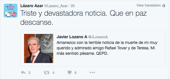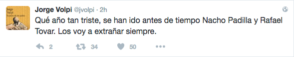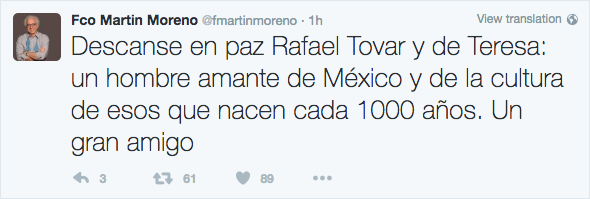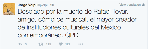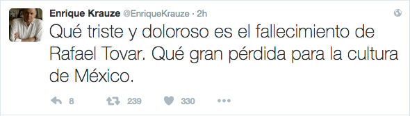 Las reacciones de tristeza ante el fallecimiento de Rafael Tovar, por parte de personalidades de la cultura en todo el mundo continúan a través de las distintas redes sociales.