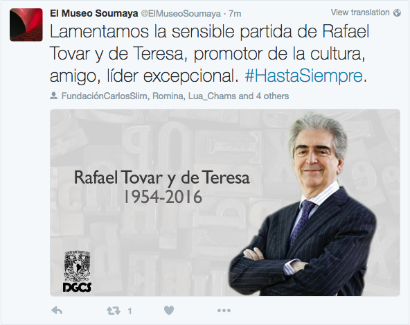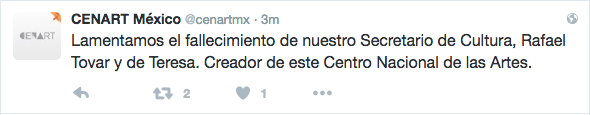 En esta misma red social, el Instituto Nacional de Bellas Artes, el Centro Nacional de las Artes, el Museo Soumaya, entre otros, expresaron sus condolencias: